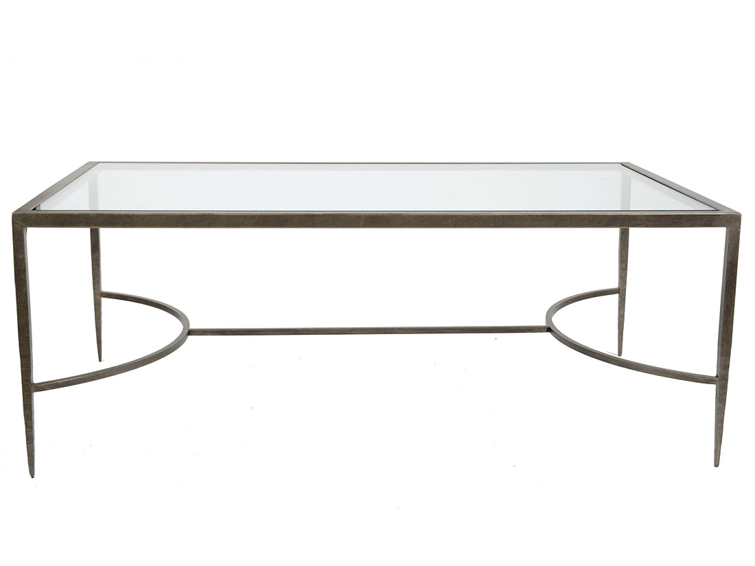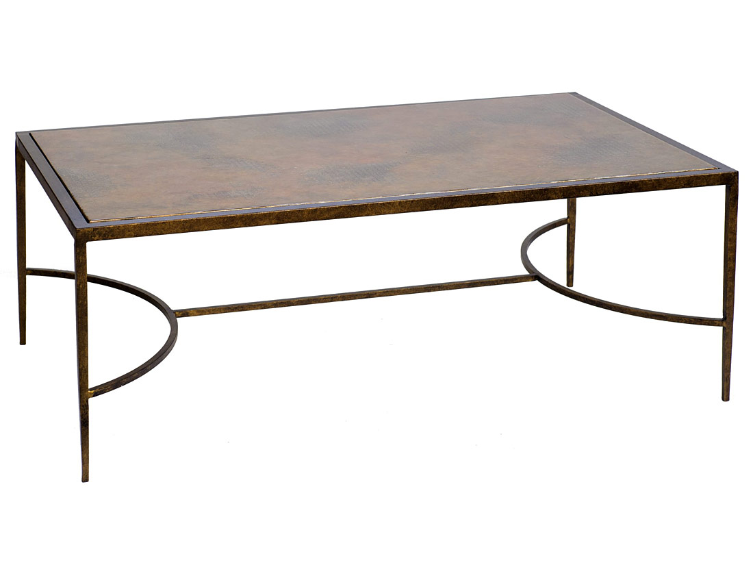 Dimensions: 48″x30″x18″H Finish Shown: Muted Bronze Notes: Detail shows table with the Statuary Bronze finish and a hand-painted wood under resin top.