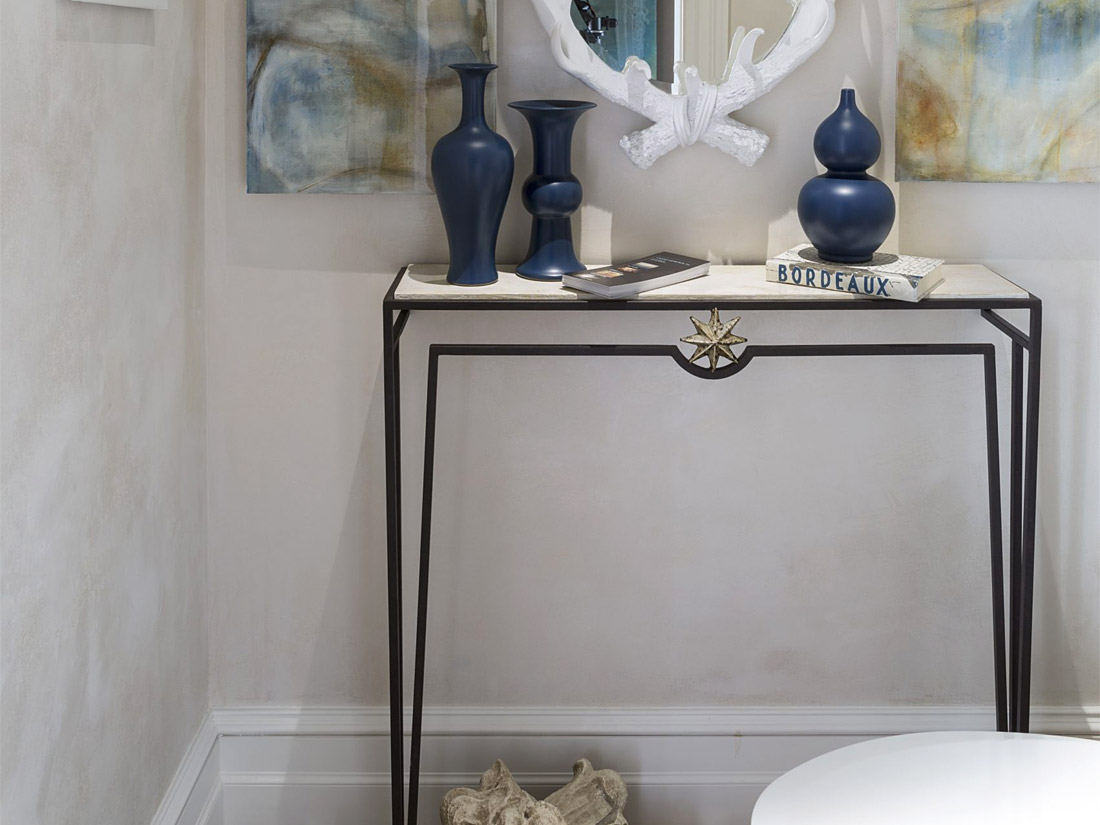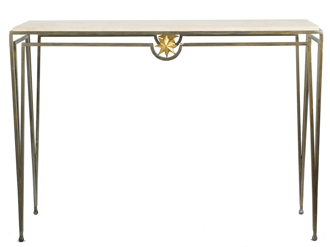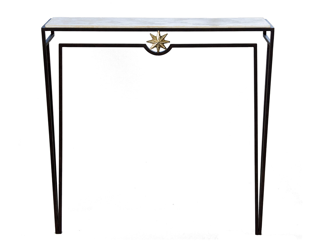 Dimensions: 48″ x 14″ x 34″ H Finish Shown: Silver Lamé Notes: Shown with limestone; Bottom detail shows 36″ x 8″ x 32″ two-leg/wall hung version of the Starburst console