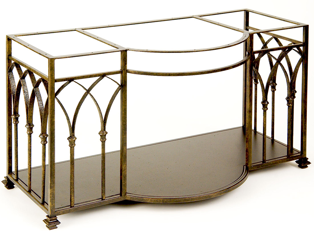 Dimensions: 60″ x 24″ x 34″ H Finish Shown: Black Bronze Notes: Artifact antique balcony front used to support client’s limestone vanity top and vessel sink