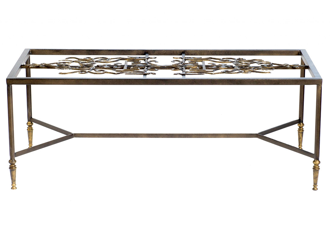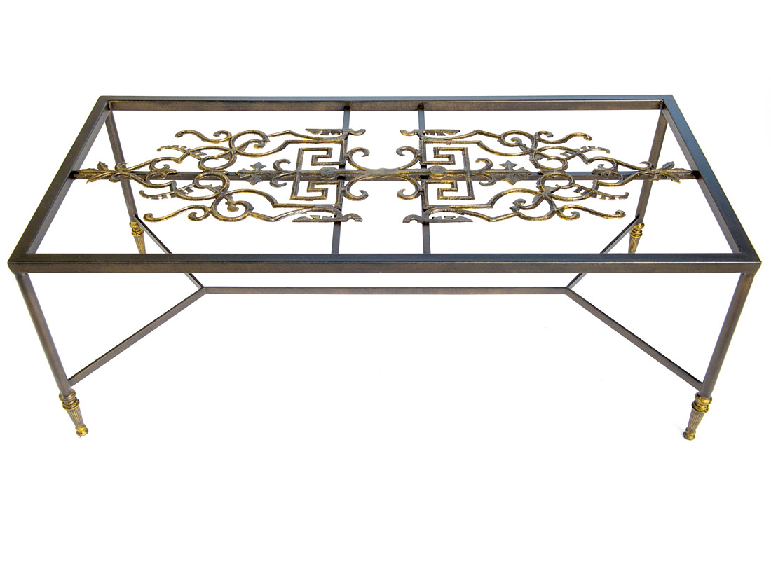 Dimensions: 40″ x 22″ x 18″ H Finish Shown: Black Bronze and Aged Brass Notes: Cross/key antique Victorian roof cresting used as support for a glass top